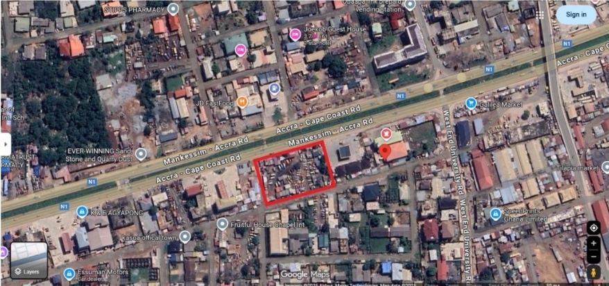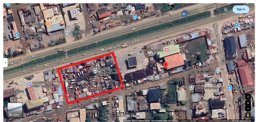 A strategically located commercial property within the red boundary (see image) is now available for sale along the bustling Accra-Kasao Road, one of the most heavily traveled business corridors in the Central Region of Ghana.